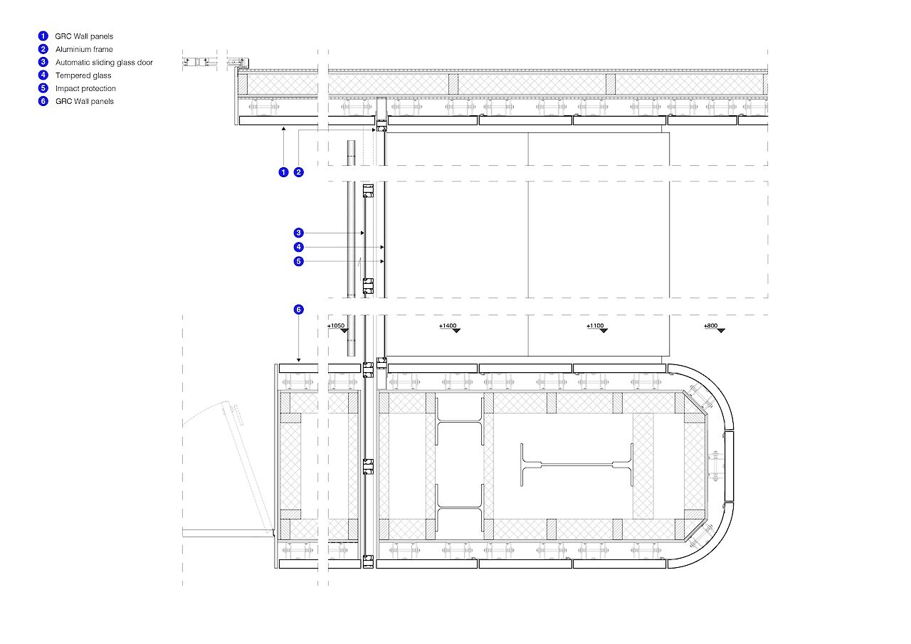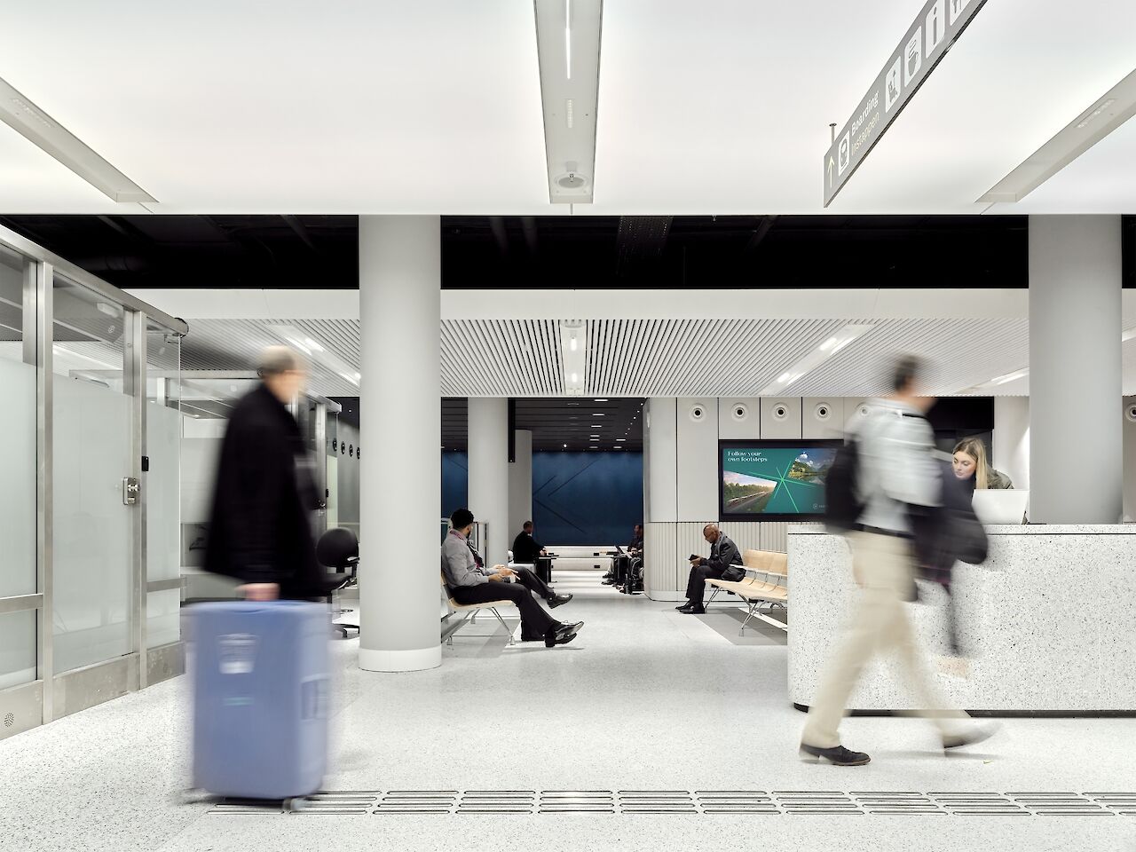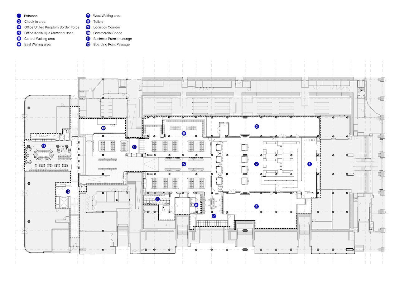 The terminal is housed in the former Amstelpassage, one of the five north-south tunnels at Amsterdam Central Station. A clear circulation strategy forms the foundation of the design and is consistently applied throughout the entire space. Travelers enter the terminal via the main entrance that faces the city, subsequently passing through baggage check and both the Dutch and British passport controls, with adjacent border force facilities, before arriving in the waiting area.