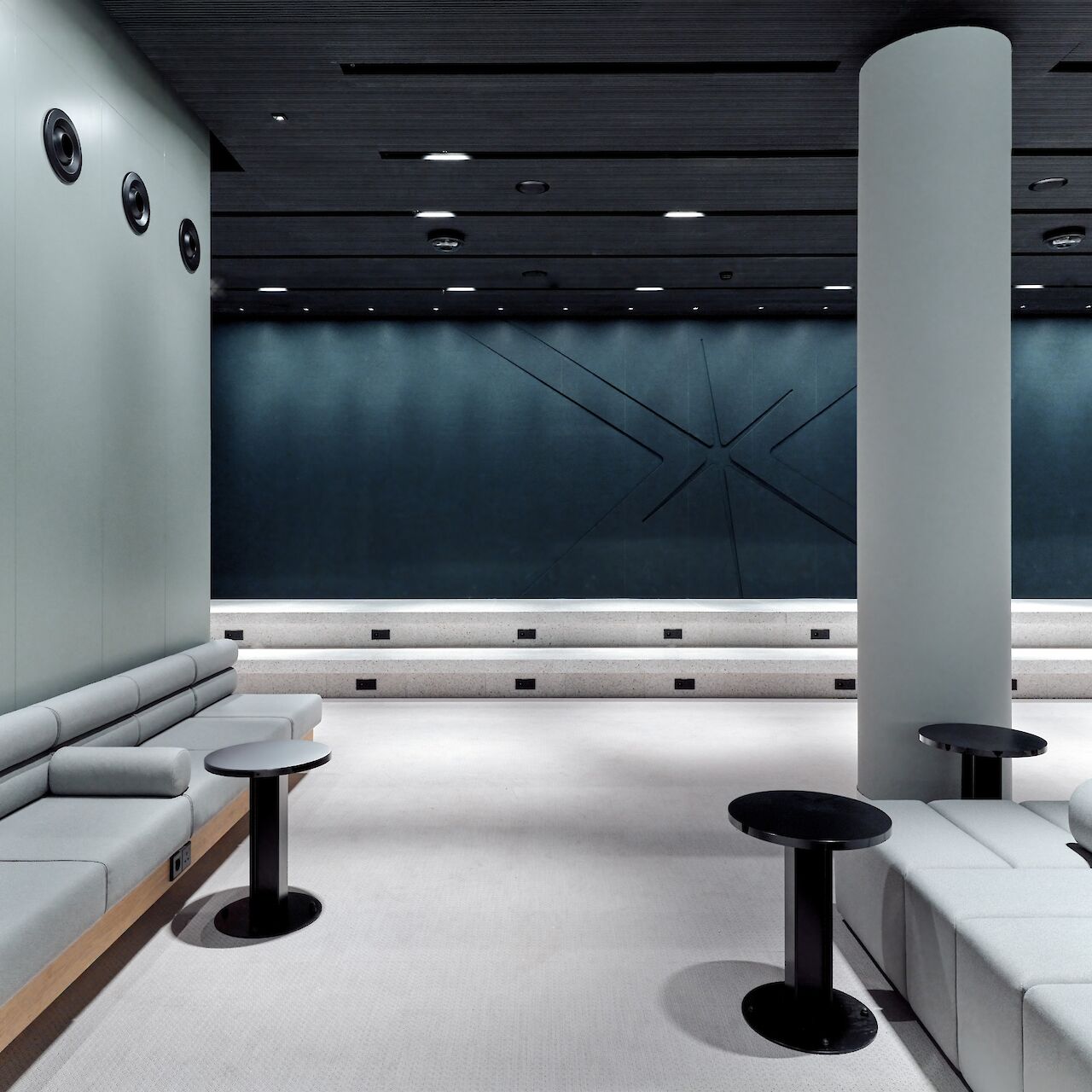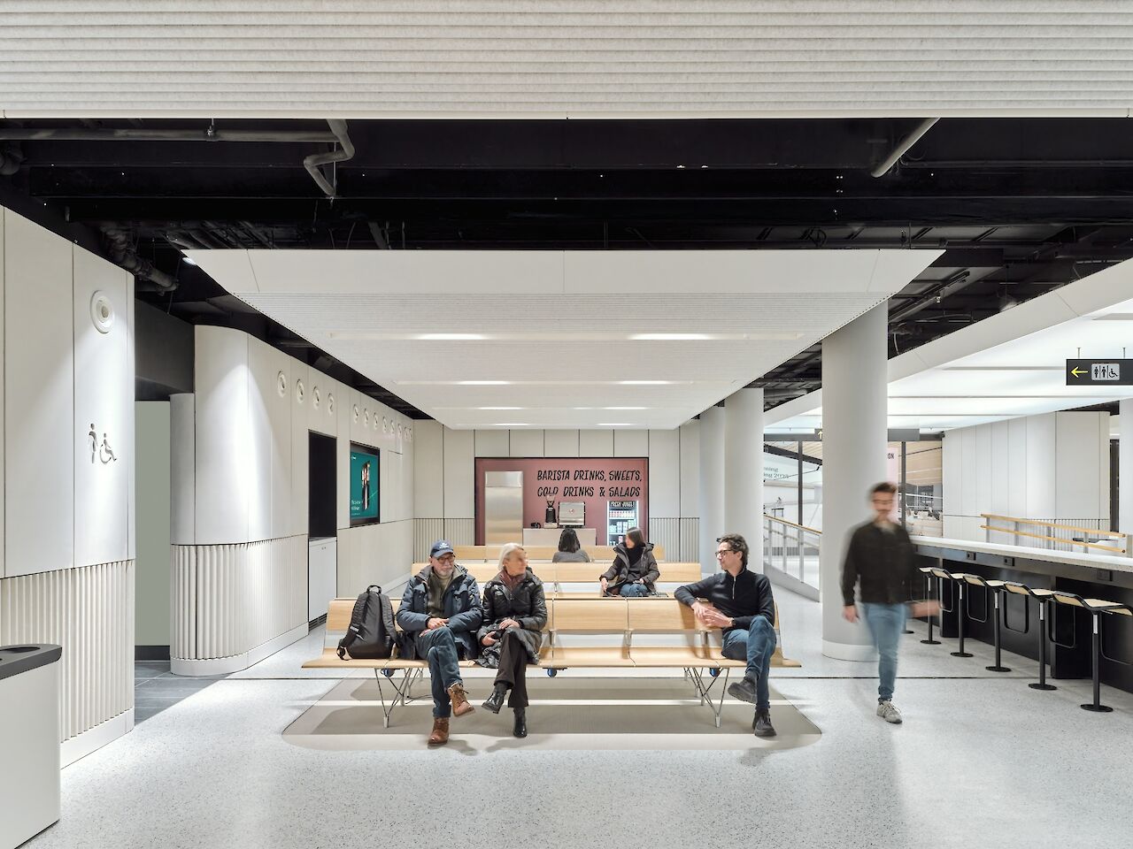 The waiting room forms the final part of the interior concept, in which the relationship between earth and sky is central, a theme that ties in with train travel and is inspired by both Dutch and British landscape paintings from the Golden Age. One of the most striking elements is the floating ceiling with dynamic lighting, with projections of dynamic moving clouds which corresponds to the boarding process. This creates an atmosphere that is both calming and activating.