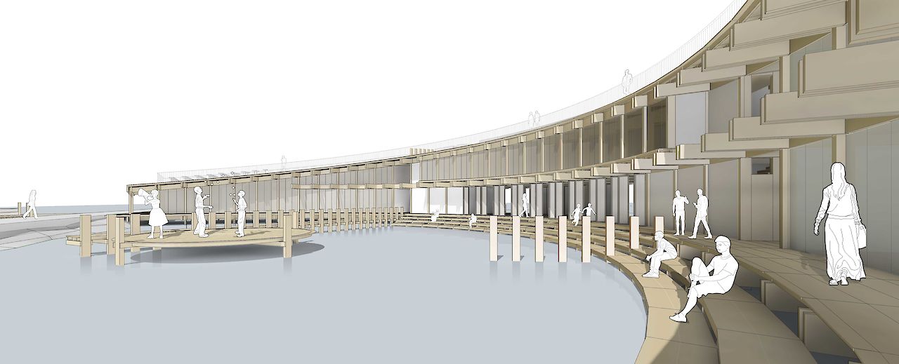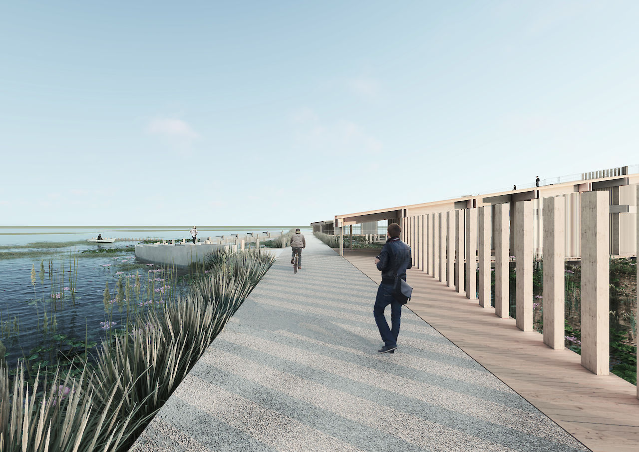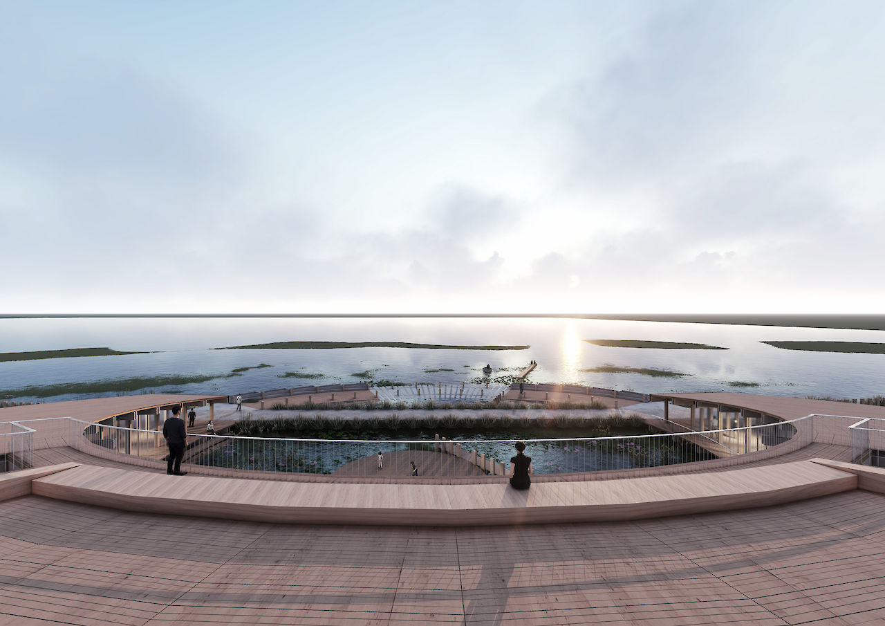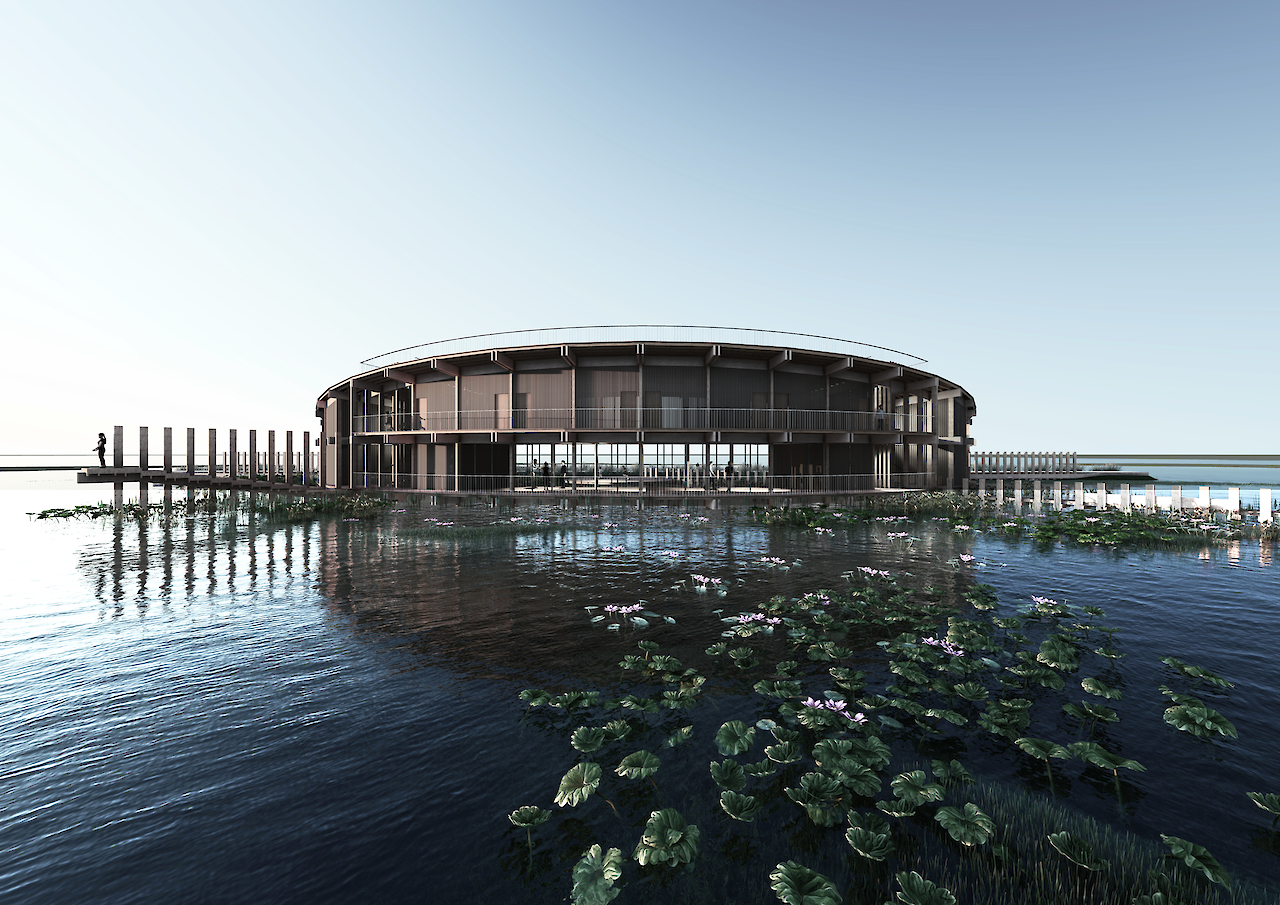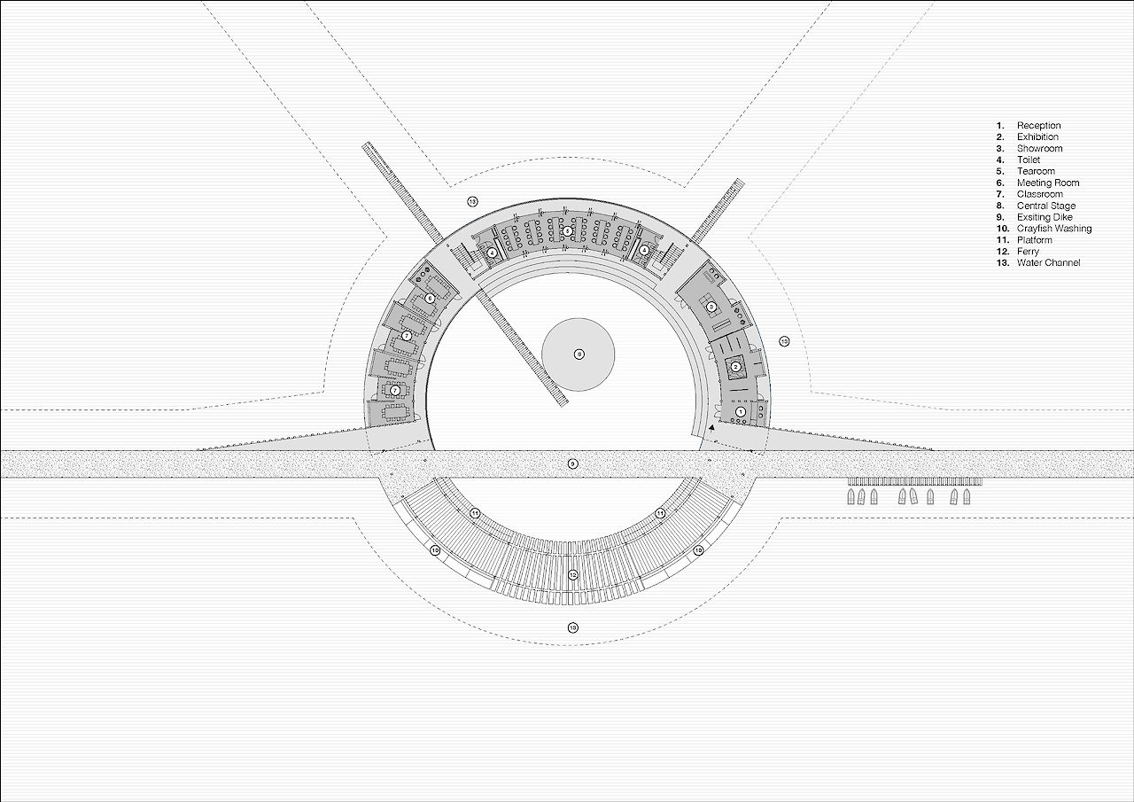 Superimpose visited the site and decided to design the new experience and education center as close as possible to the farming location, and even intended to be part of it. The circular ring shape is superimposed on an existing dyke situated between two different types of crayfish ponds. With its remarkable but prominent location the project becomes a literal bridge between farmer and visitor and promote interactions between visitors and farmers. The dyke also provides access to the pavilion.