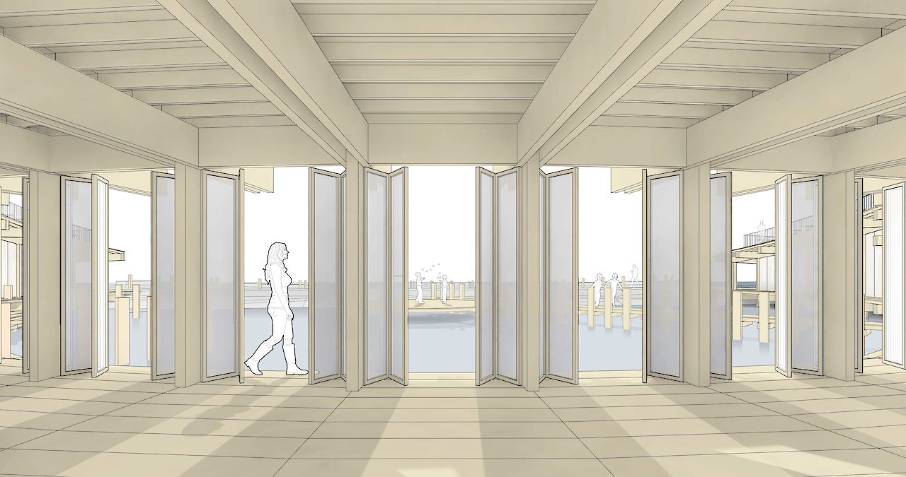 The repetitive wooden structure gives the building a clear structural and recognizable framework. From the main circle, it’s possible to access even further onto the crayfish ponds by walking along one of the boardwalks, which stick out like tentacles. These boardwalks create the opportunity to explore and contemplate in the ponds. At the center of the circle, boardwalks create a circular auditorium and stage.