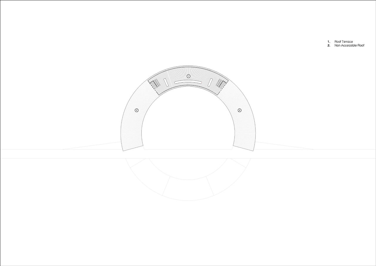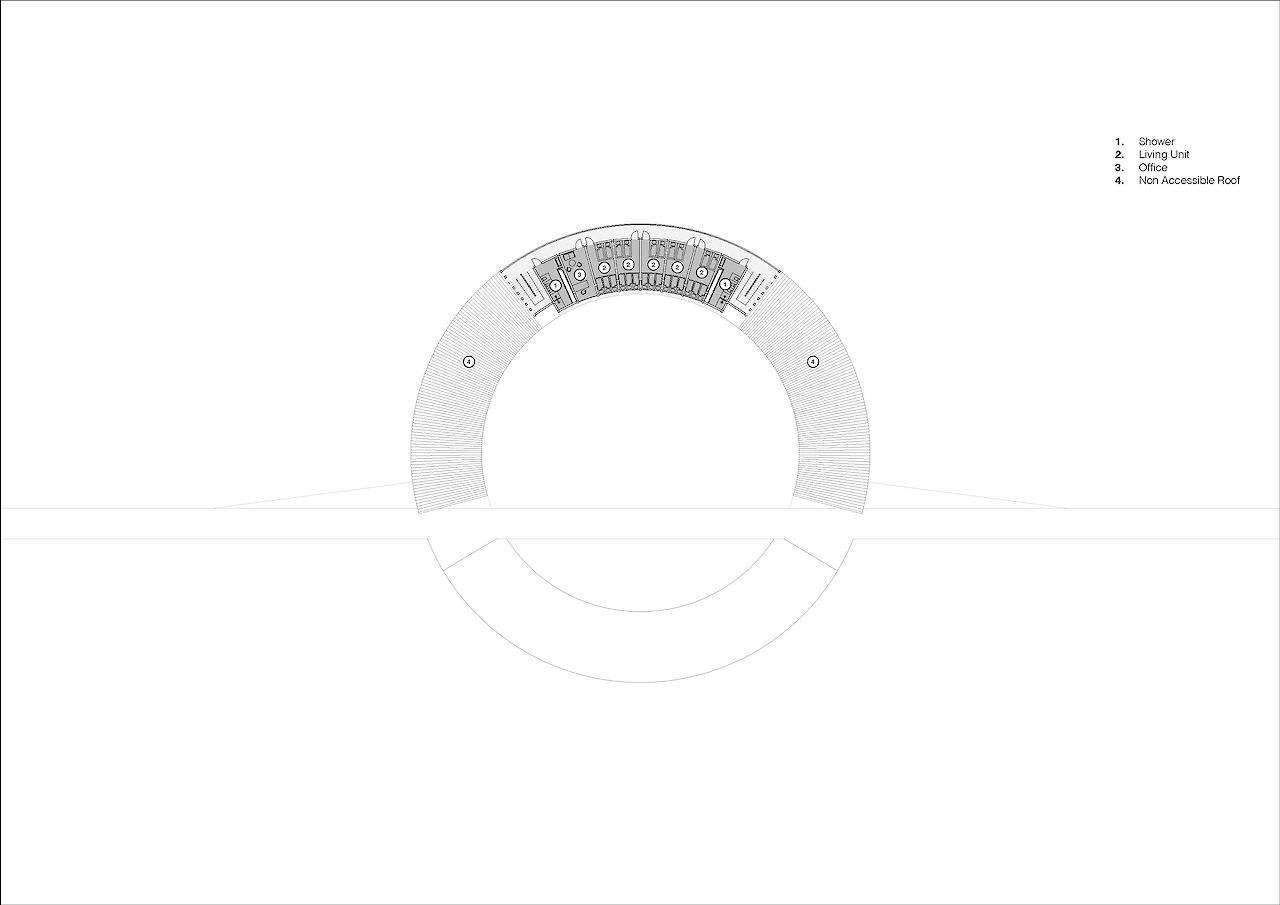 The roof of the circular building is tilted, creating a full loop experience. The visitor can look at the crayfish ponds from the roof of the pavilion, which is the highest viewpoint but also become part of the crayfish farming process at the lower part of the tilted circle.