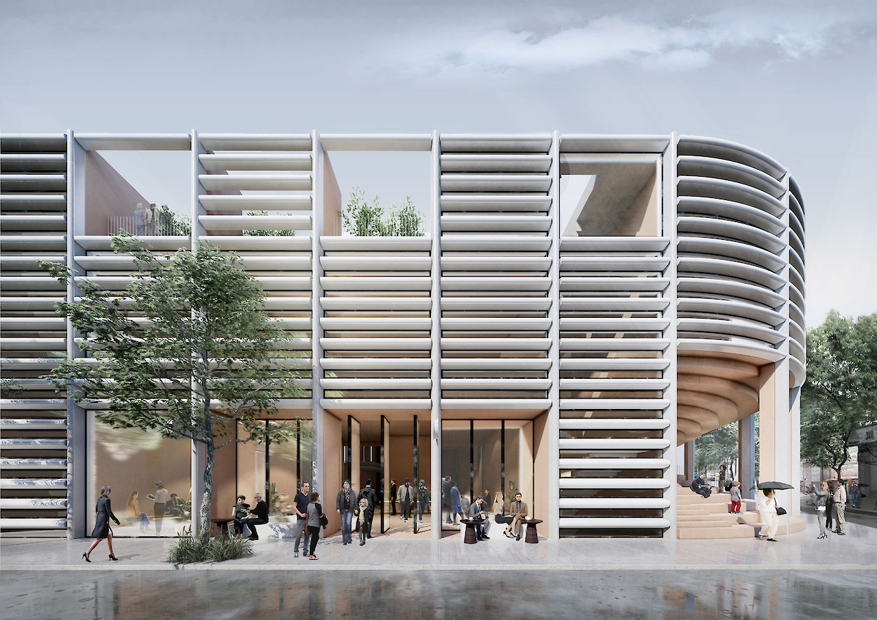 The proposed new façade refers to the scale of the surrounding building blocks and improves urban integration of the building volume. Vertical façade columns break down the scale of the building into smaller more suitable elements. In between these vertical columns, horizontal bars provide the right balance between openness and privacy for the program behind the facade.