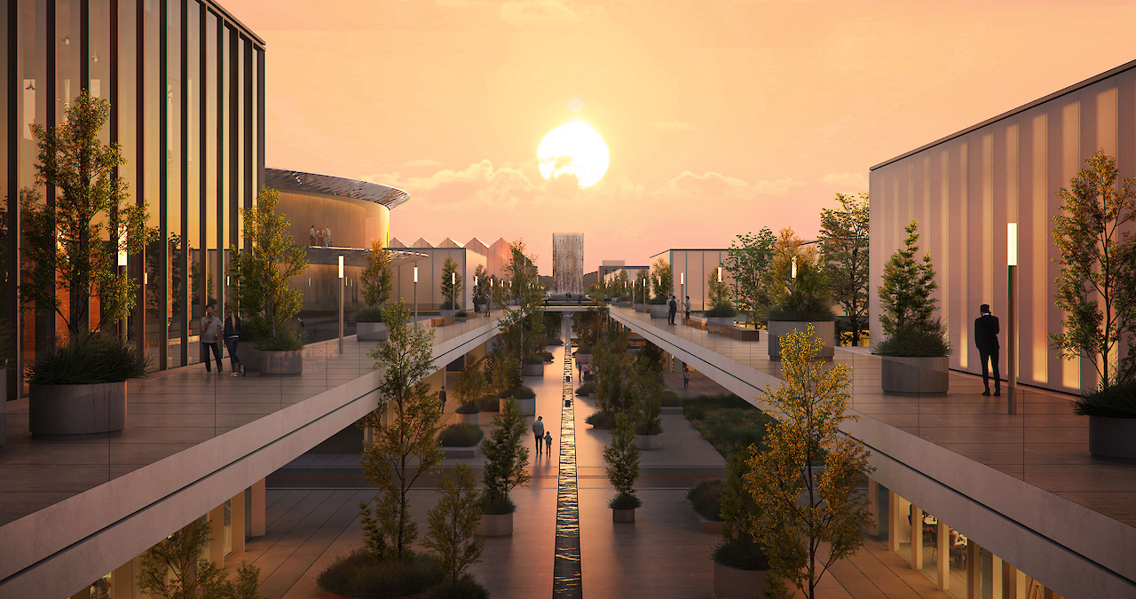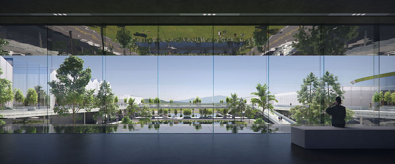 The first strategy used is the introduction of a ‘green axis’: An external - partly covered - corridor connecting the individual buildings and functions together from East to West. The axis is flanked with regional plants and has a small canal in the center that leads to two water features at both ends. It allows for the surrounding green to connect to the heart of the site. Centrally located in the masterplan, and on the North-side of the central axis, a circle-shaped business hotel and a conference center are the most iconic buildings of the scheme. On the south side of the green axis, commercial functions are grouped together as a retail zone.