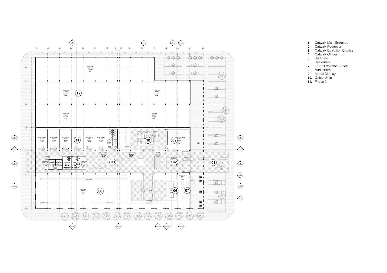 Coinciding with the central catwalk, a white ‘veil’ metal mesh is hung from the ceiling. The ‘veil’ is hung in between the repetitive beams and columns, articulating the rhythmic structure of the architecture. The application of the ‘veil’ helps softening the industrial space. It filters the daylight from the roof light and defines a human scale within the vast space. Light fixtures are placed in between and above the mesh, creating multiple light configurations for different occasions during the evening.