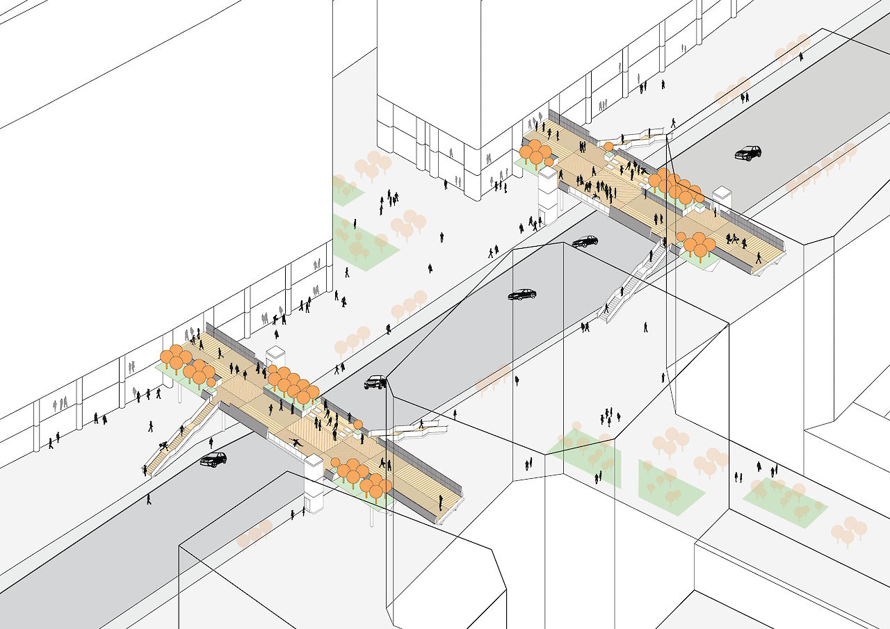 The bridge groups have different designs but share simple structural and circulation principles, keeping the project within budget. Every bridge group refers to its own season by unique spatial arrangement, circulation strategy, colors, vegetation typology, materials, and shape. The balustrades of the bridges play a special role in the spatial experience and appearance of each bridge. The bridges’ main purpose is to connect efficiently. Simultaneously they provide places where the people can stay, communicate, enjoy greenery and relax.