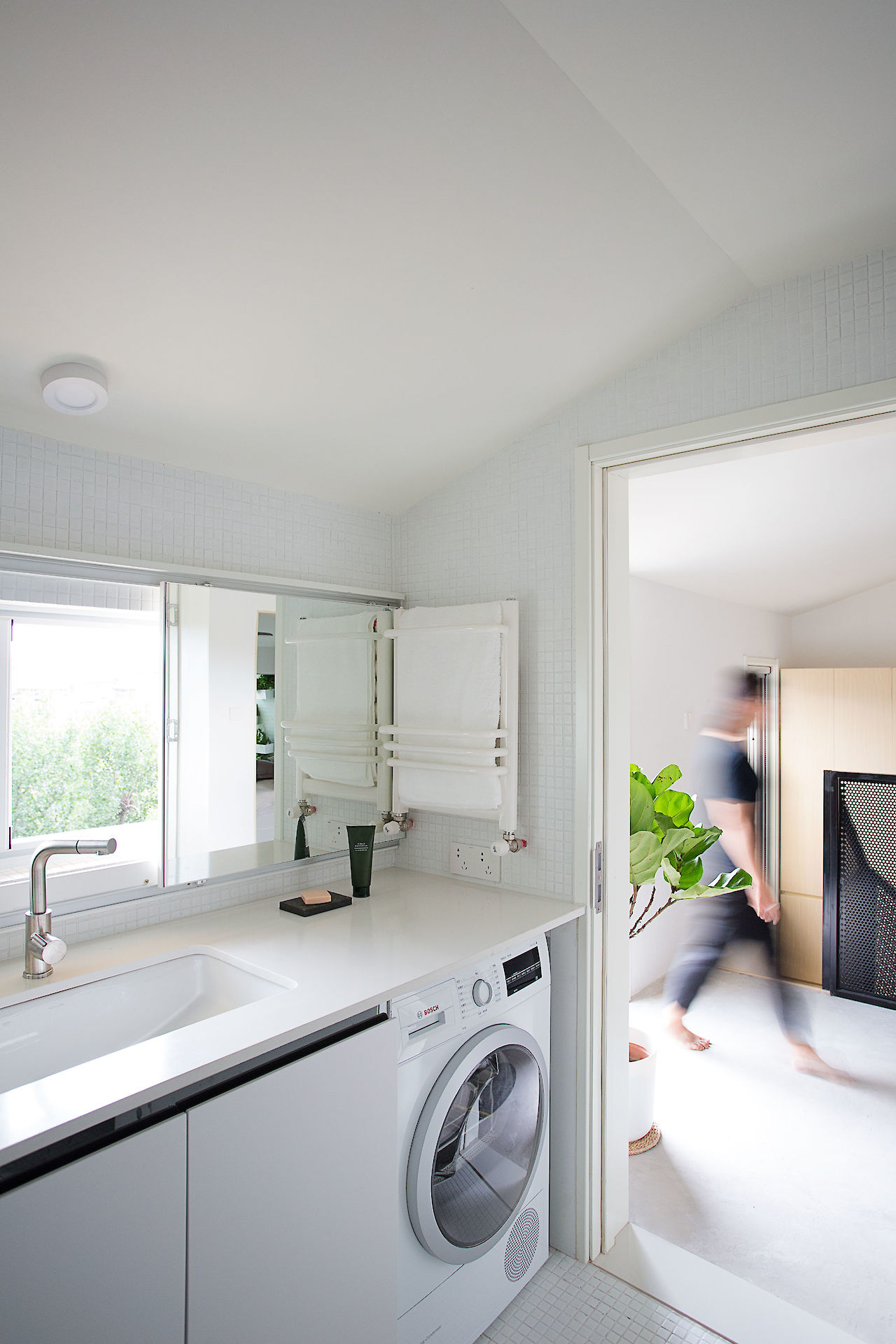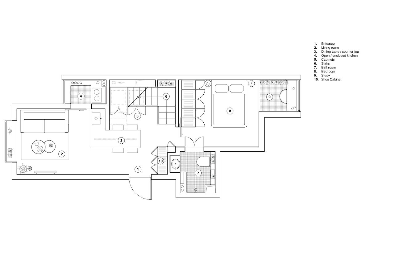 In order to make the small apartment feel spacious, smart solutions were applied to integrate storage space such as utilizing the space underneath and surrounding the staircase and under lower beam locations. Boiler, gas meter, electricity inlet, air-conditioning units, fridge and oven are integrated around the staircase. The first floor bathroom is hidden behind the cabinet wall whilst the second floor hosts a larger bathroom where washing and drying machines are located.