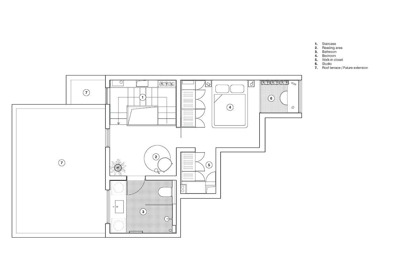 To make better use of the present daylight, Superimpose’s re-arranged the function layout according to the orientation of the sun. By switching the living room and bedroom, the living room now orientates to the west and the bedroom to the east. With this rearrangement the Sun-Loft’s bedroom receives the morning sun, and the living room receives the afternoon sun, corresponding to the routine of the young couple.
