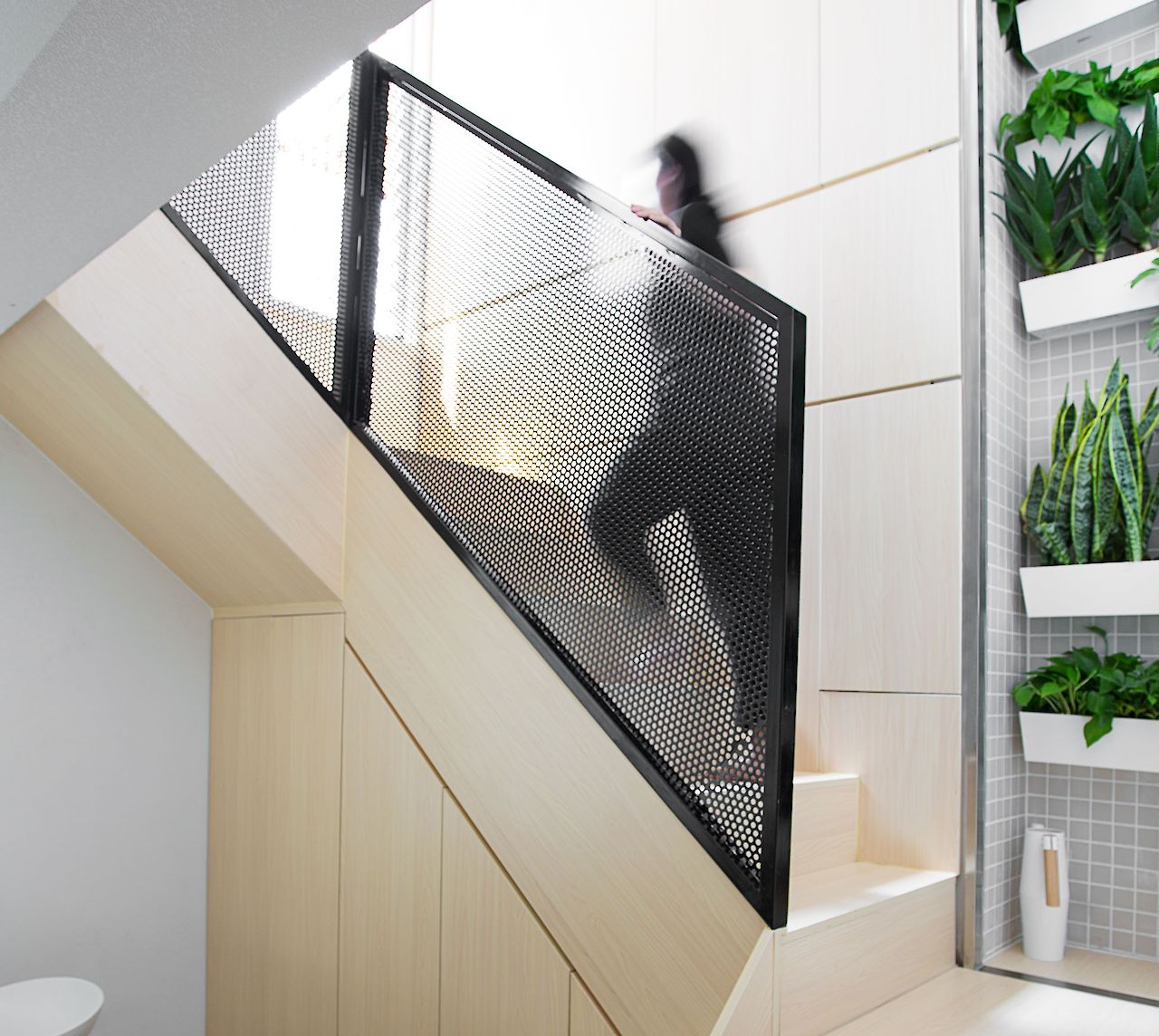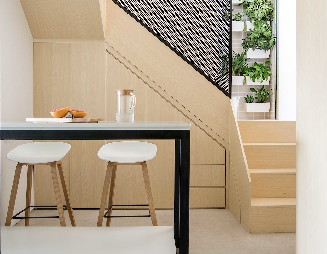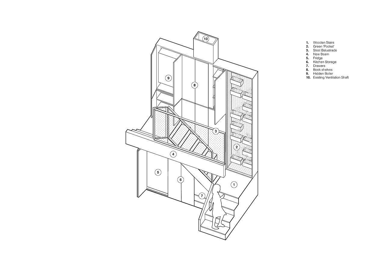 The central staircase features a collection of the planters, highlighting the green character of the space upon entering the apartment. A similar strategy is applied to the formerly dead-end and un-usable pocket spaces as they are transformed into a study room and a winter garden.