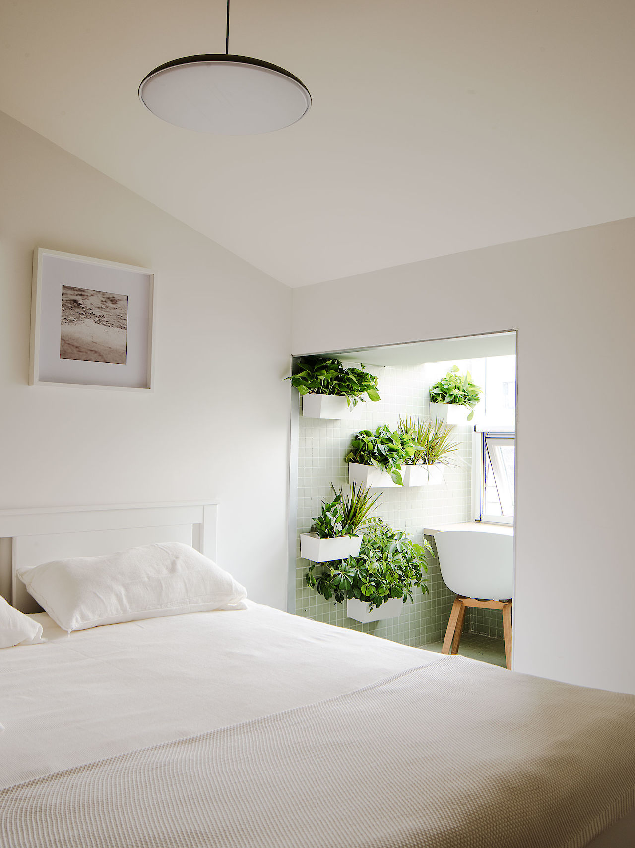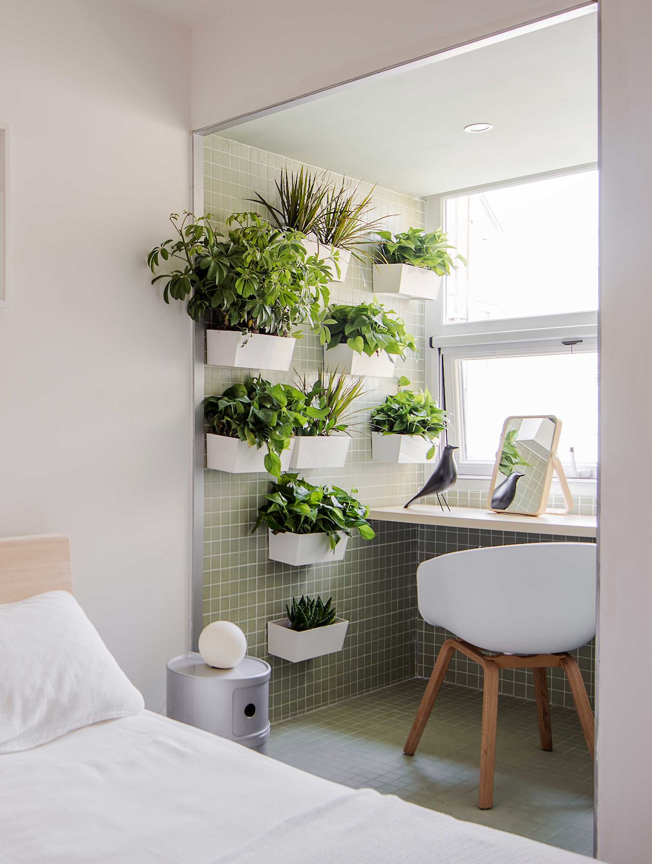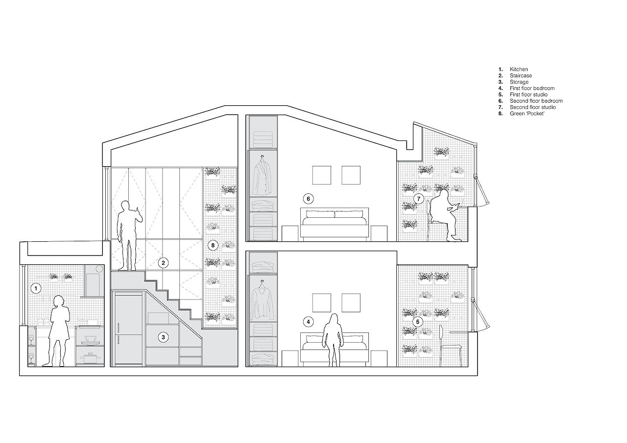 The central staircase features a collection of the planters, highlighting the green character of the space upon entering the apartment. A similar strategy is applied to the formerly dead-end and un-usable pocket spaces as they are transformed into a study room and a winter garden.
