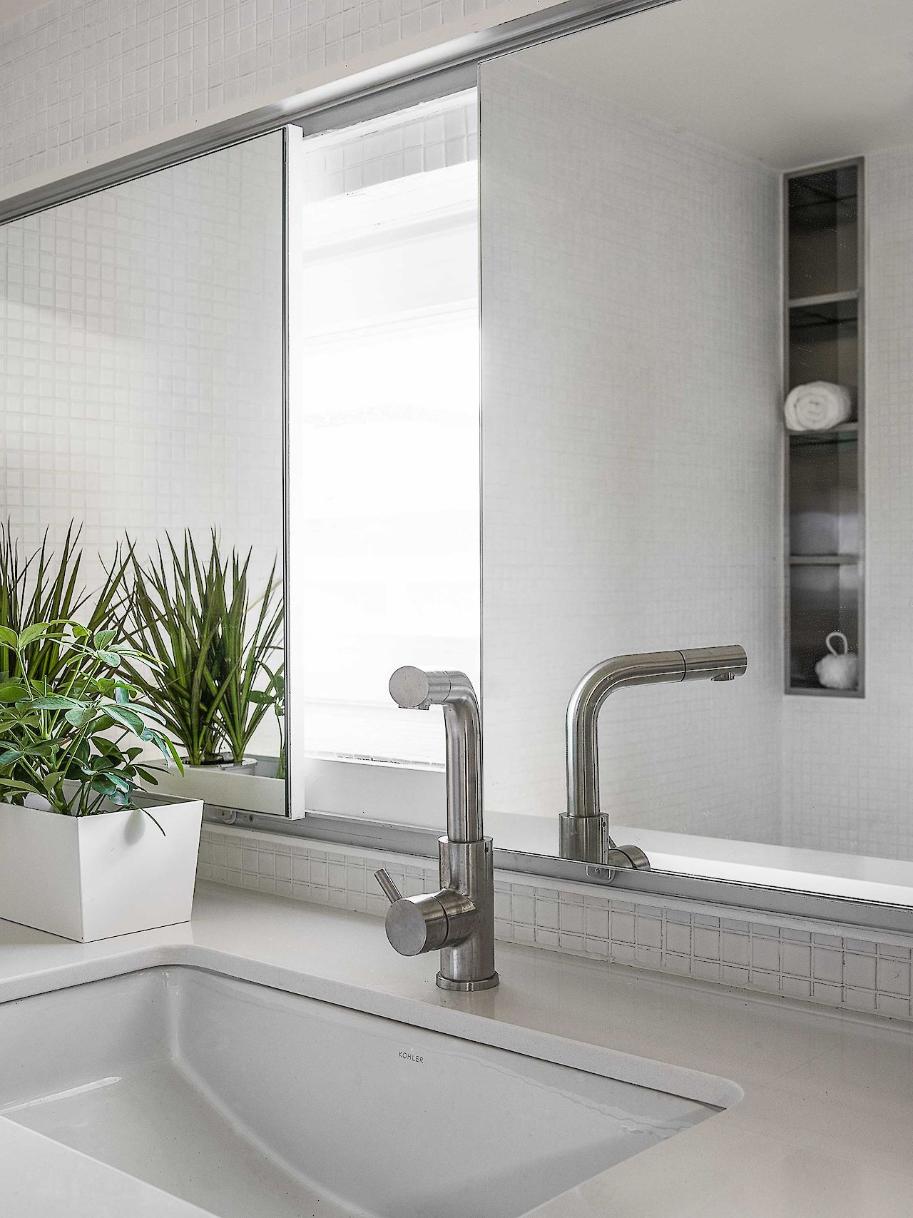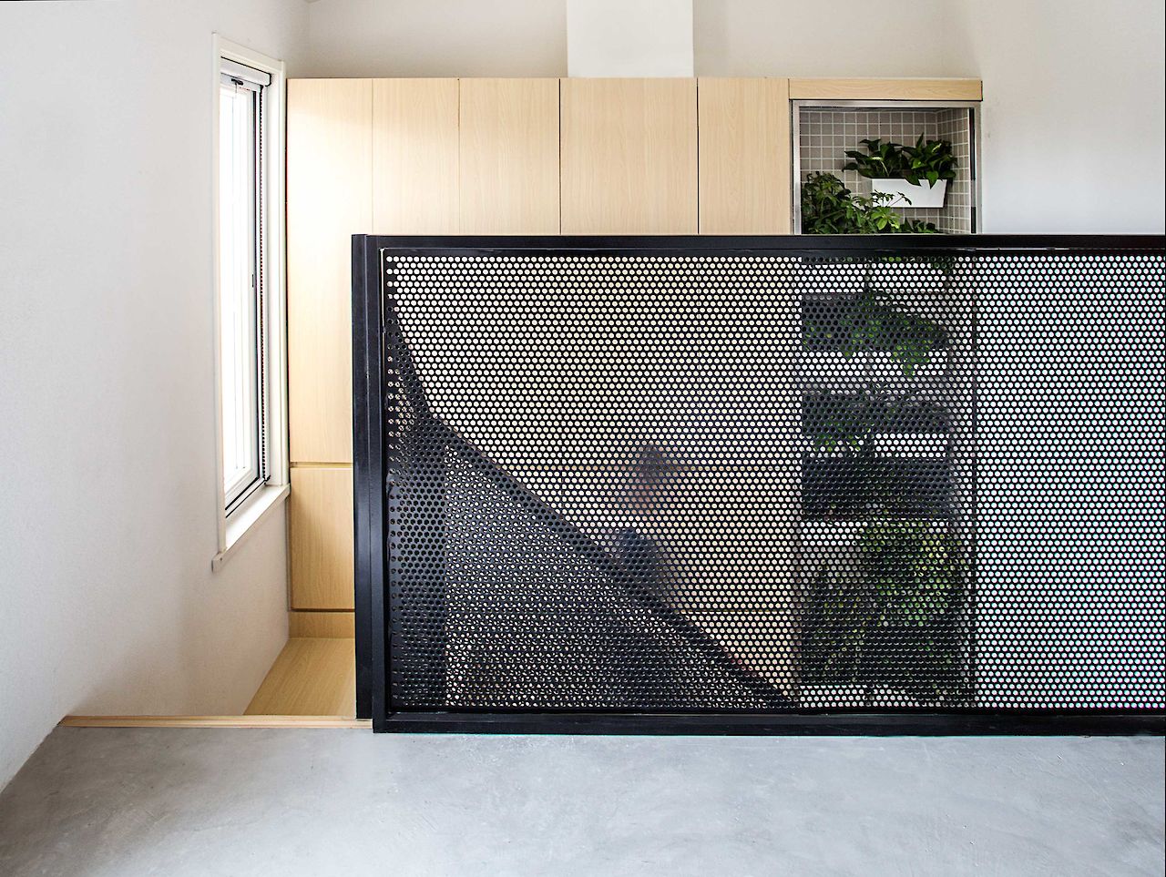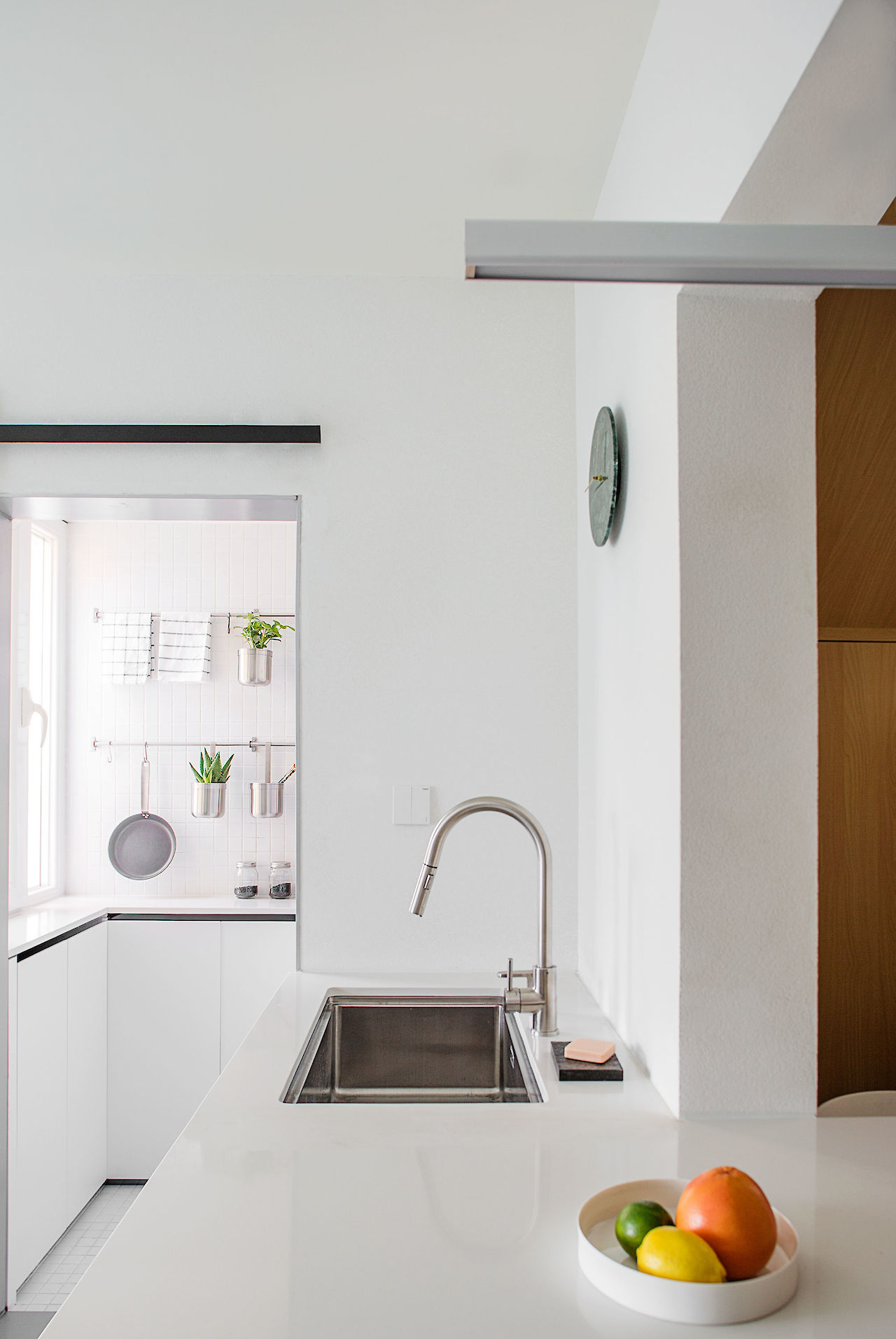 Superimpose proposed to demolish walls blocking the entrance of daylight and a new staircase was introduced in the center part of the apartment, making the brighter spaces available for the living room and dining area. A void is created to place the staircase as the centerpiece and to channel daylight from the second floor to the darkest part of the lower floor, simultaneously showcasing the double height and spaciousness of the loft. A black balustrade adds contrast to the apartment and accentuates the architectural importance of the staircase. One hundred plants are growing inside tiled alcoves placed through the apartment.