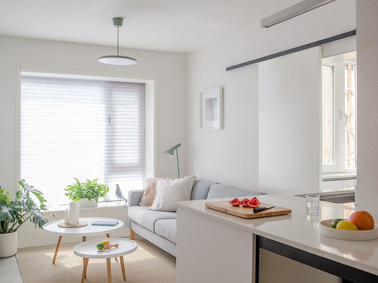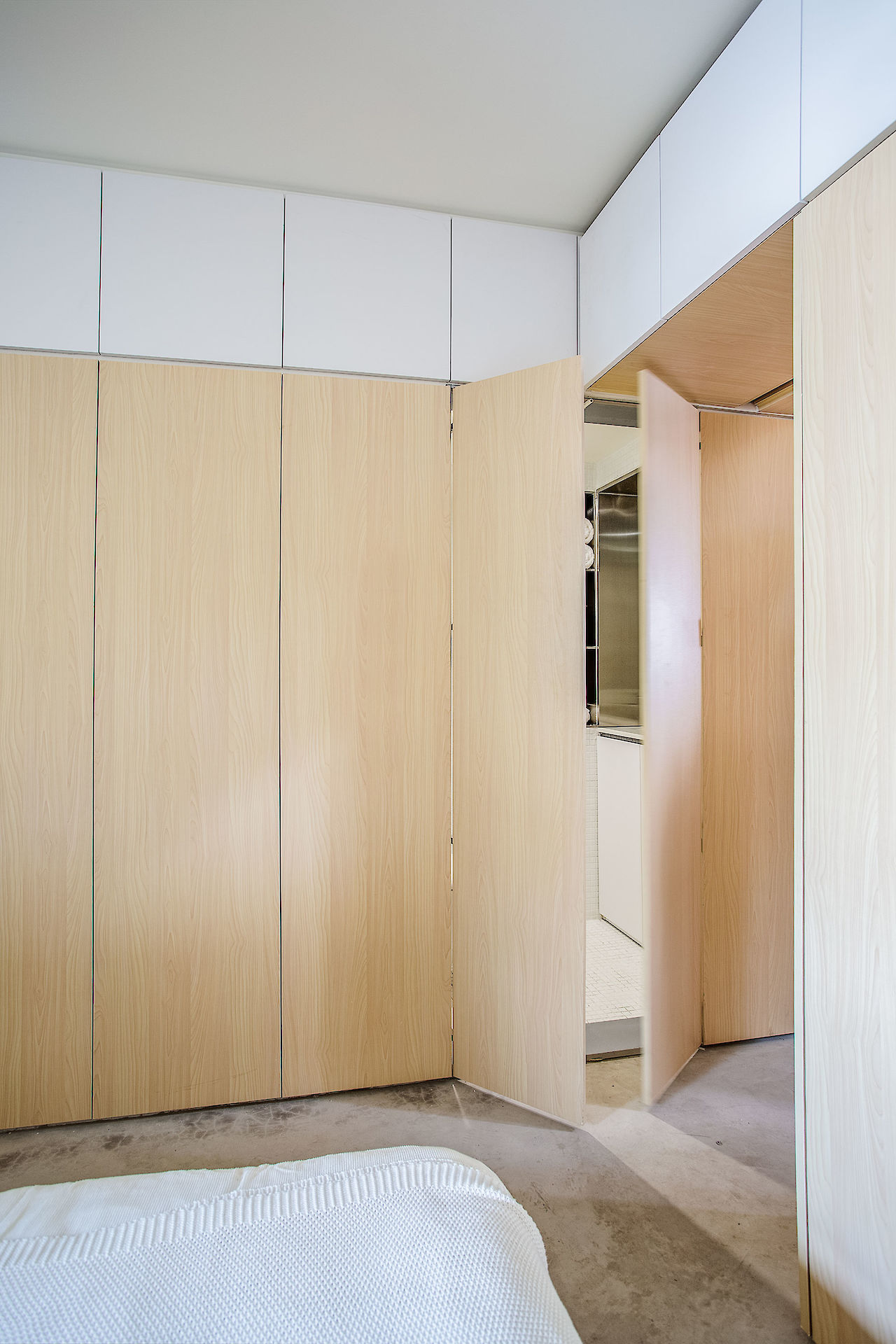 The landlord insisted on having an enclosed kitchen to prevent cooking fumes entering into the living room. Superimpose organized the plan in such a way that the cooking area could be fully separated with a sliding door, whilst no concessions were made to the spaciousness of the living and dining area. The kitchen countertop extends through the space forming the dining table, making it both suitable for dining and for cooking preparation.